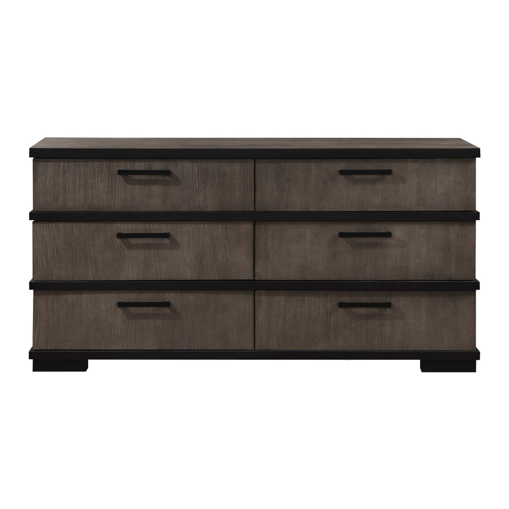 Modern lines pair with texture and hue to create the dynamic look of the Acworth Collection. The two-tone brown-ish gray and black finish over oak veneer of the collection lends to the modern-industrial inspired aesthetic that comprises the collection’s design. Black bar hardware fronts the drawers of the drawers of the dresser, their minimalistic lines providing bold accent to the piece.
