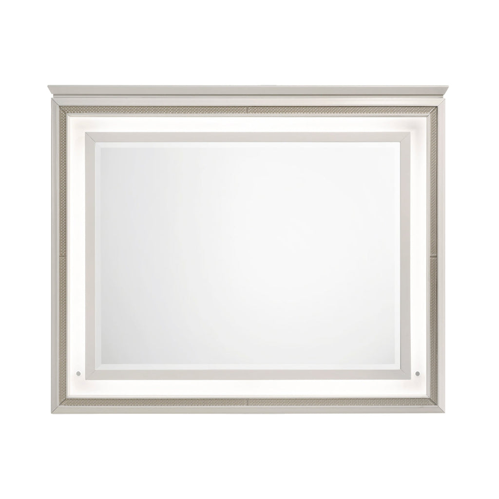 Add a touch of Hollywood glamour to your bedroom with this stunning white and gold dresser mirror. Featuring integrated LED lighting, this mirror provides both functional illumination and a sophisticated ambiance. The chic two-tone finish in white and gold complements a variety of décor styles, adding a touch of modern elegance to your space. Designed to perfectly complement your dresser, this mirror enhances the visual appeal of your bedroom while creating a brighter and more inviting atmosphere.