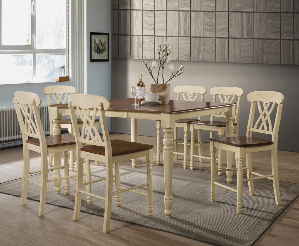 ACME Dylan Counter Height Table, Buttermilk & Oak, 54"W x 36" ~ 54"L x 36"H (Inc. 1 x 18" Leaf), 86lbs. The Dylan collection features convertible table top with removable leaf, and turned legs, all carefully crafted with selected wood and veneers in rich buttermilk and dark oak finish. Matching side chairs offer overlapped "X" backrest design, wooden seat top, and turned front legs providing a warm and cozy country style for your dining room. (Table and Chairs Sold Separately) Features: - Square & Rectangular Leg Table - Wooden Top (w/1 x 18" Leaves) - Wooden Turned Leg - Features: Multi-Tone Oak Finish (Top & Seat), Buttermilk Finish (Leg & Backrest) - Matching Armless Chairs - Wooden Seat & Back - Wooden Backrest: Overlapped "X" Shape - Wooden Turned Leg (Front) - Collection Dylan: Dining Single Pedestal 70330, Counter Leg Table 70430 Materials: Wood, Veneer, Composite Wood