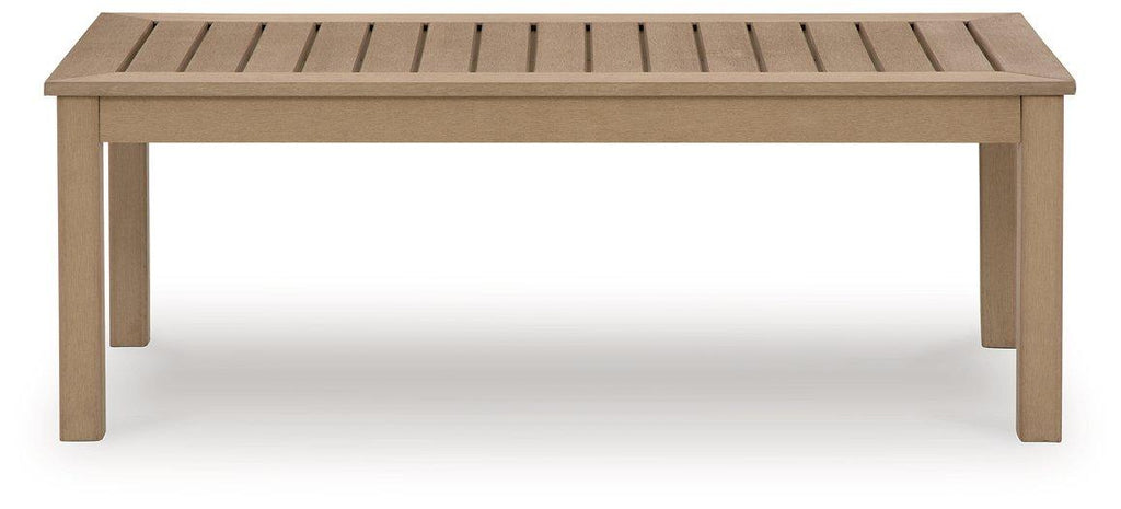 This coffee table is a beautiful addition to any outdoor living space. Effortless in its simplicity, this piece echoes your easygoing sensibilities. Combining durable, cutting-edge engineered materials, its Weatherwood construction in a blond wood color enhances the contemporary design. Pair this table with the matching sofa and chairs for a spectacular backyard or patio seating arrangement.