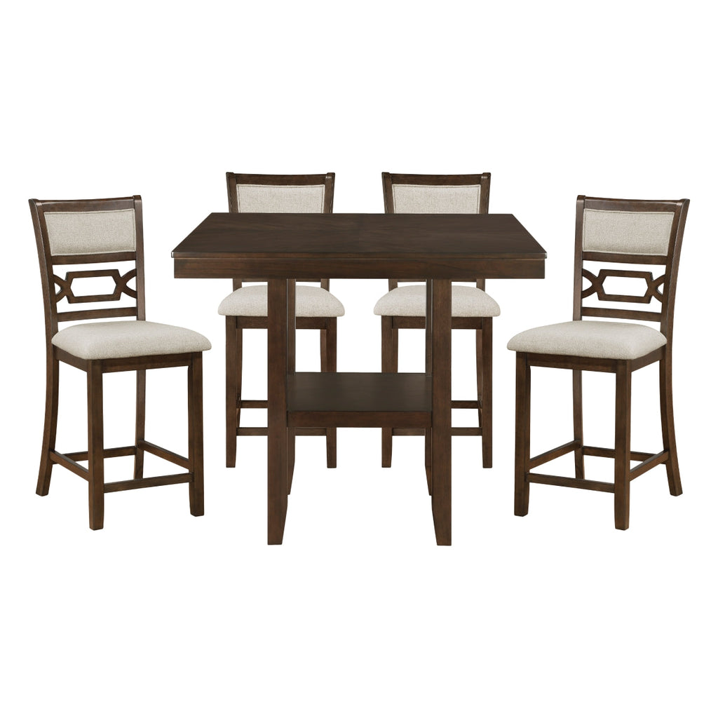 Create a cozy and inviting dining space with this stylish 5-piece counter height dining set. Crafted from Mindy wood veneer, solid wood, and engineered wood with a rich dark brown finish, this set includes a counter height table and four matching chairs. The table features a convenient open shelf for storage or display, while the chairs offer comfortable seating with beige textured fabric upholstered cushions. Perfect for casual meals or entertaining, this set comfortably seats four and adds a touch of warmth and elegance to any kitchen or dining area.