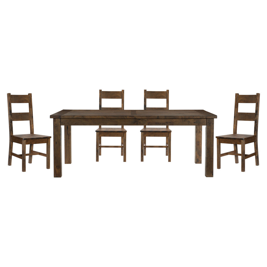 Classic transitional design serves as a base for the natural qualities of the solid wood utilized to create the rustic look of the Jerrick Collection. The rustic look of the fixed-top dining table, bench, and coordinating chairs is enhanced by the burnished finish over the solid wood grain, allowing each plank to serve as a unique accent to the overall design of the casual dining group.