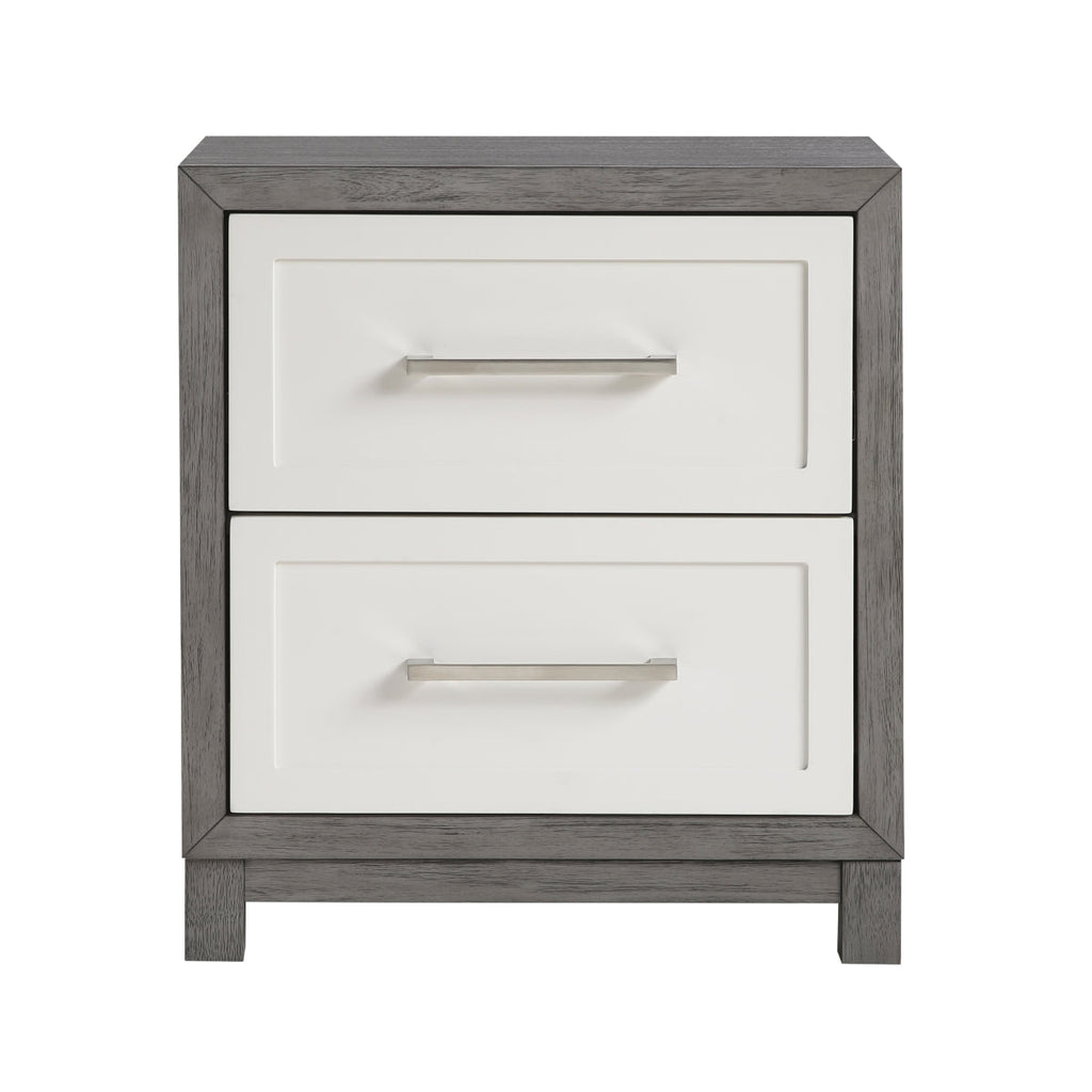 Add a touch of modern sophistication and practical bedside storage with this two-tone nightstand, featuring a unique ivory and gray finish crafted from okume veneer, wood, and engineered wood. The nightstand boasts two dovetail drawers with smooth ball-bearing glides, providing ample space for your nighttime essentials. Polished nickel-tone bar pulls add a touch of contemporary elegance, while the sturdy construction ensures durability. Perfect for any bedroom, this nightstand combines style and functionality. Assembly is required.