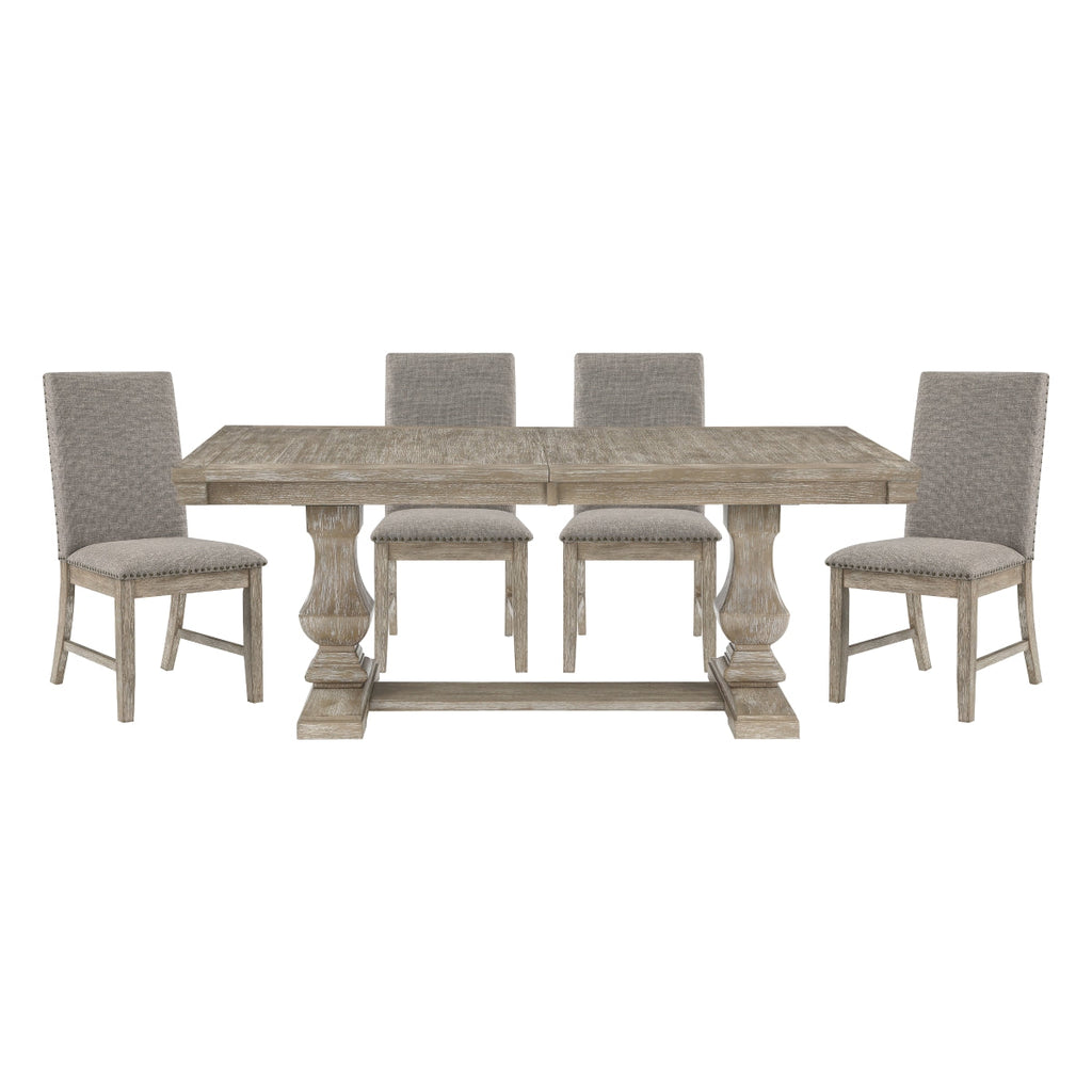 An elegant blend of traditional styling and rustic aesthetic combines to create the look of the Southlake Collection. The rectangular tabletop is supported by a double pedestal base, it’s urn profile lending distinct accent to your dining room. The wire-brushed rustic brown finish highlights the oak veneer. The brown linen-covered seats and backs of the side chairs provide complementing contrast to the table. An available bench provides an alternate seating option. The available server provides ample behind door and drawer storage in which to stow your tabletop accessories. The server doors and drawers feature nickel bar and knob hardware.